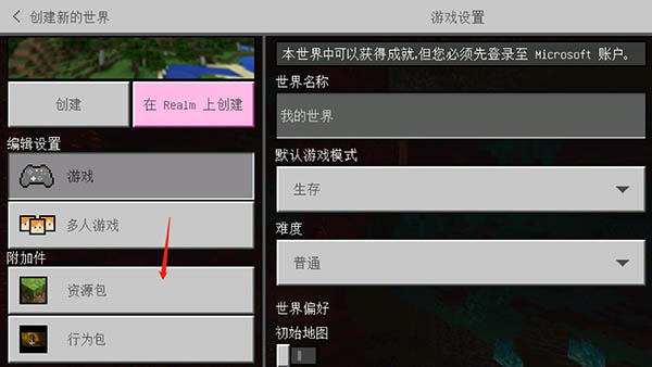 4、进入创建新世界界面,在左下角-附加件中点击“资源包”;