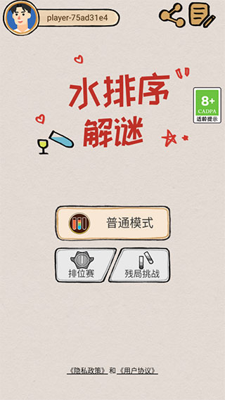 1、首先下载好本站带来的水排序解谜游戏,进入首页大家可以看见有普通模式和排位、残局挑战,当然也是需要等级之后才能解锁