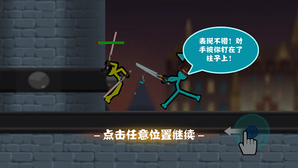 1、首先下载好本站带来的火柴人决斗最新版,进入游戏内大家需要学习新手教程,第一步学习击败敌人,拿起自己的武器按住方向键挥动武器