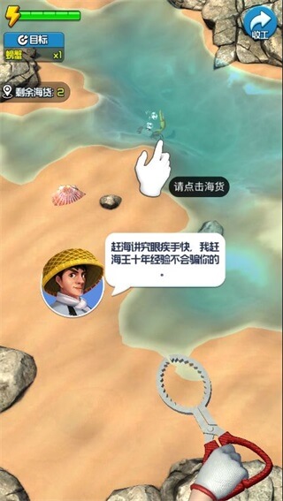 在海滩边发现了好东西?不要犹豫,点击海货就可以将它抓住~