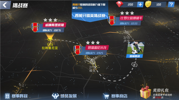 之后是排位赛,排位赛是我们跟其他玩家一决高下的比赛,战胜排名比自己高的玩家,我们的就可以上升到他所在的排名,拿到更高的排名,就可以每天获取更多的欧元,更多的宝石和更多的排位币。在排位赛中,我们无法进行操作,一切的战术指示都是按我们赛前的布置进行的。所以,我们需要观察对手的阵容,思考对手所采用的战术,在赛前就换一个能够克制他的战术。另外还有巡回赛和挑战赛,巡回赛需要派出自己的球员加入到其他球队的阵容中参加各地的商业赛;挑战赛每天都有15个关卡,我们要按照关卡条件去完成比赛,才能拿到最丰厚的奖励,否则我们仅仅只能通关。