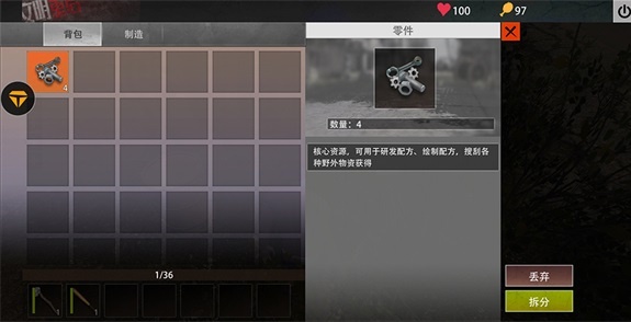零件:零件作为发育的必需品,无论在前期还是中期我们都会需要它,它的主要用途就是来升级配方台、研发配方图,前期发育它是必不可少的需要品,这些零件获得的在路边敲罐子击杀NPC丧尸等都可以获得