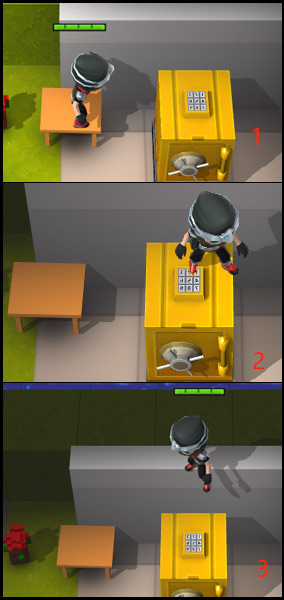 我们是可以踩着物体跳到保险箱上面去开锁的,那样警察第一炮不会对我们造成伤害,而且可以迅速跨墙逃离!