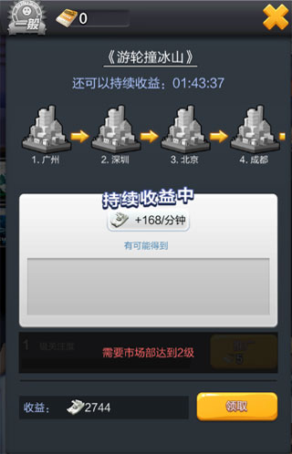 经过一系列主线后我们会解锁市场功能,市场可以产出大量的金币和粉丝,派遣合适的艺人担任形象大使更会提高资源产量。越往后的城市产出资源越高,还有别忘了资源会有资源存储上限,记得偶尔上线领取一下。