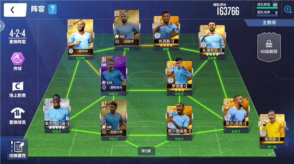 1、可以打424,如上图,波霸替换德布劳内,斯特林换阿奎罗打中锋,孙还是打左边锋,中后卫随便拿一个用着。