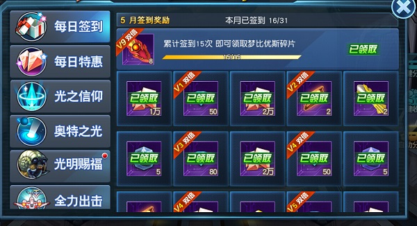 同时月卡党可以利用每日签到帮助参加光之信仰,有些签到日期对应不同钻石数,不同等级的vip可以根据自己等级完成光之信仰活动。