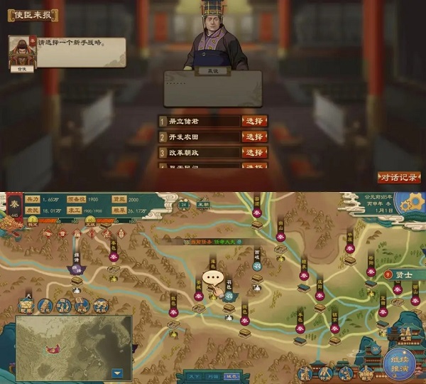 政策:实行政策和选择国家流派,君上可以根据自己的玩法来选择合适的流派,夏酱推荐新手可以尝试一下,儒家,农家,道家,上手后可以玩法家,兵家,想搞谍战等特殊玩法可以玩,墨家,道家。