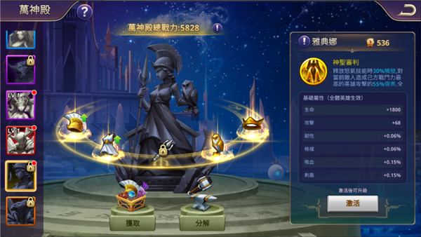 每座神像都可带来不同的祝福和技能。神像界面的基础属性为圣物部件基础属性总和,升级圣物部件,可提升属性值。基础属性对全体英雄生效。除了赋予全体英雄的属性加成外,不同的圣物部件也会有额外属性加成。例如:美杜莎的圣物部件会为单体型英雄额外加成。每个部件的加成独立计算,只要单个部件等级达到要求即可激活。