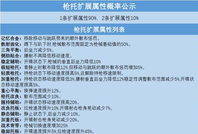 枪托共有16个扩展属性,在所有词条都有的情况下,选择性是远远高于其他配件的,并且弹闸也和其他配件一样也分为4种品质(白色品质,绿色品质,蓝色品质,紫色品质)其中白色没有扩展属性,绿色有一个,蓝色有两个扩展属性,紫色有三个扩展属性,下面说一下我的推荐吧~