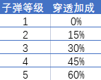 子弹一共有5个等级,每个等级和每个等级的穿透能力也不一样,并且每个等级也都代表一个品质(1级-白色,2级-绿色,3级-蓝色,4级-紫色,5级-金色)下面以表格的形式来展示出来各个子弹的穿透能力
