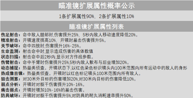 瞄准镜共有12个扩展属性,在所有词条都有的情况下,可选择的还是非常多的,并且瞄准镜也分为4种品质(白色,绿色,蓝色,紫色)其中白色没有扩展属性,绿色有一个,蓝色有两个扩展属性,紫色有三个扩展属性,下面说一下我的推荐吧~