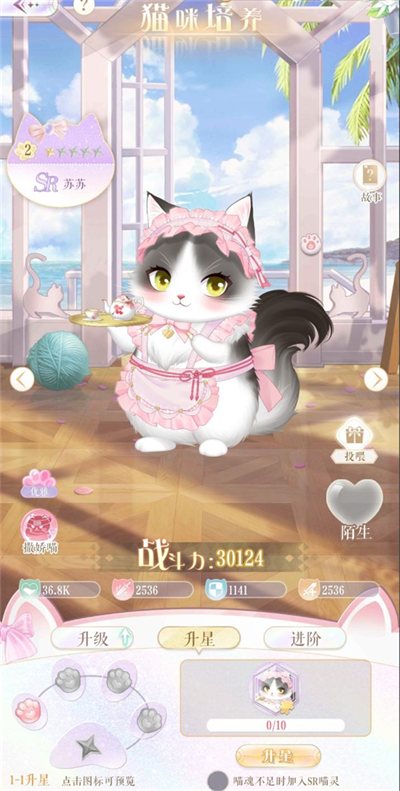 猫咪可以通过升级,升星和进阶三个方式进行养成,提升战力,升级需要消耗喵币,可以通过小镇经营和猫咪演出应援获得。