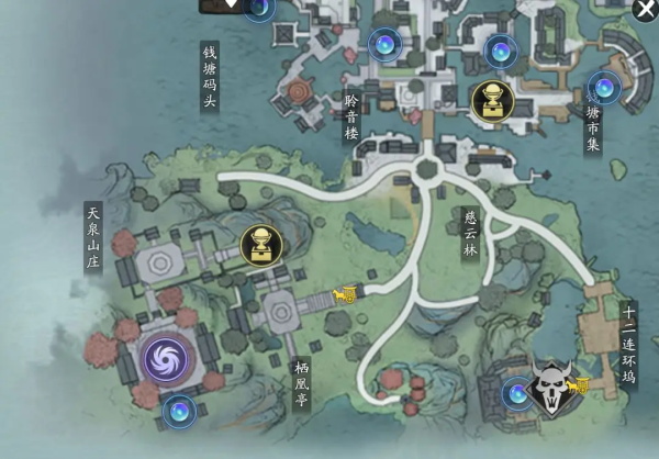 探索进度的传送点一共有九个,在没有完成主线之前,我们可以激活淬剑谷、铸神谷、华清寺、雪衣谷、十二连环坞、钱塘镇、江南码头、天泉山庄这8个点,最后一个传送点云上之城需要完成3次主线解密之后开会开启。
