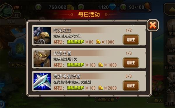游戏一开始跟着新手教程走,熟悉一系列操作后一直推本,前期副本没什么难度,只要记得把可以装的装备装到英雄身上就行了。由于前期获得的多数是力量型装备,大概2级的时候就可以进阶船长了。在推本的过程中多留意右边菜单的任务,战队2级左右可以领取灵魂石召唤宙斯。菜单里的每日活动可是前期获得经验的宝藏级区域,一定要多留意。3级左右完成通关10次副本的每日任务后可以获得120战队经验,战队直接从3级升到7级。