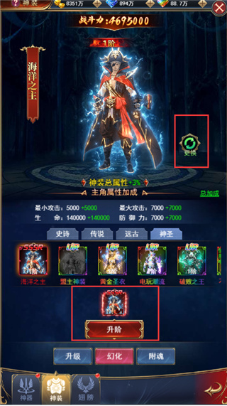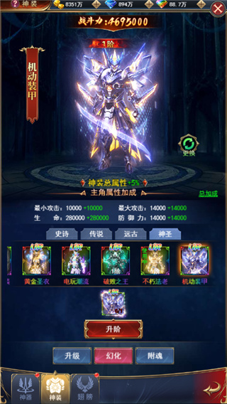 可在角色界面里点击“神装”进入该界面,可以看到神装界面主要有升级、幻化、附魂3个功能玩法,其中“幻化”里就有各类时装造型,并有品质之分,从低到高为史诗、传说、远古、神圣。