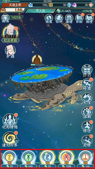 身为洪荒天道,可化形出十大分身同时修炼,从而疯狂提升天道等级、洪荒实力。而在化形修炼的同时,还可以添加炉鼎增加修炼收益,添加金丹增加修炼效率。