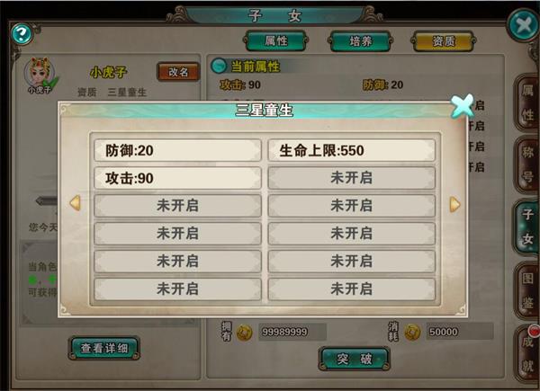每当子女当前资质等级经验充满的时候可消耗对应材料突破资质,每突破一层资质,子女将获得额外的加成属性,资质等级达到特定等级时可解锁更多的属性,子女资质满层80层。