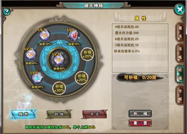 现世:可祈福20次,随机祈福符文槽属性加成10%,单个符文槽加成上限50%。