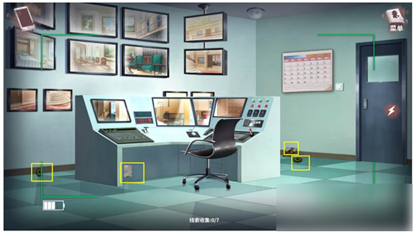 1、搜证:2油画,2齿轮,显示屏,监控,日历,门,地板,墙壁密码锁,屏幕;