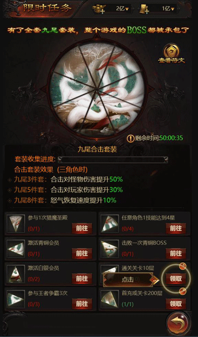 2、然后再完成限时任务,激活套装效果伤害提升效果明显,通宵挂机,早上神装、稀有材料塞满背包!