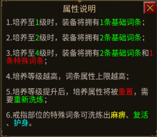 二、培养装备。通过吞噬X件同等级同部位的常规装备,获得带词条属性的培养装备。拥有:常规装备属性战力(固定)+词条洗练属性战力(浮动),培养等级越高,词条可洗练属性越高,属于进阶装备。备注:1、我们的版本没有特戒,麻痹、复活、护身全靠词条洗练,人人都可以拥有特戒。2、培养装备需要消耗大量的常规装备和材料。凡是能提升战力的消耗材料都是值钱的