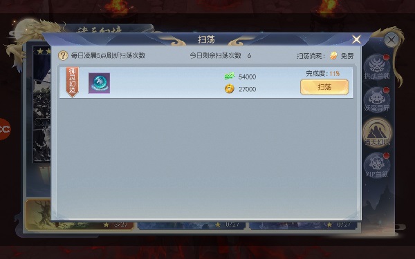 界面中会显示已开启章节的扫荡奖励列表、每日都有固定的免费扫荡次数。