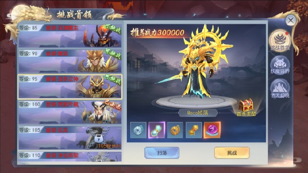 点击“挑战”进入挑战首领·副本场景,成功击杀boss后,显示结算界面。挑战成功一个BOSS之后可以点击“扫荡”快速挑战首领直接获得副本奖励。
