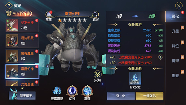 魔宠之中首推橙色宠物的【雷霆幻神】,其终结技能在造成大量伤害的同时,提供暴击、暴伤。此外两个被动效果分别能提高我方伤害、降低敌人移速和伤害。
