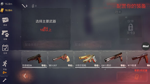 3、发展期间避免解锁任何东西,所以打完第8关解锁狗后就停下来反复刷第一关搞发展,在D98-满级、双筒8-满级、强盗9-满级、M32散弹8-12级、民兵HK-A58-12级前少解锁其它武器。(银币不够的话优先升M32、民兵HK-5A)。