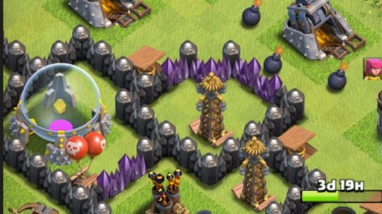 较好的布阵方式是在有围墙保护的防御建筑外围放置几个非防御建筑,吸引敌人火力同时,让自己的防御持续输出。如下图: