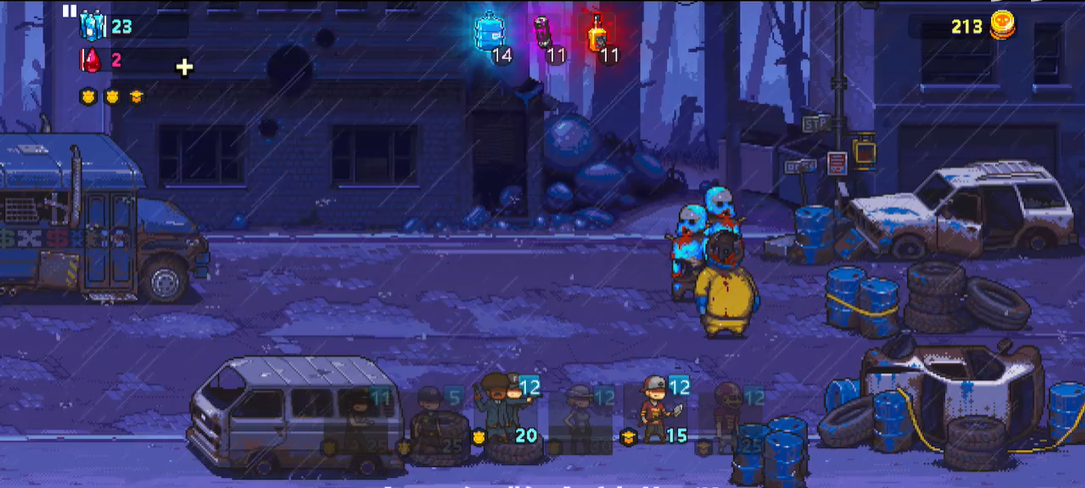 全民僵尸大战2025最新版是一款像素风格的策略游戏,进入游戏后,玩家需要去扮演的是一支部队的头领,保护卡车上的同伴,不择一切手段冲过层层障碍封锁,驾驶卡车带领同伴穿过一片片危险的关卡。如果硬要形容的话这款游戏其实类似于《植物大战僵尸》。但玩家不需要收集太阳光种下植物,而是会缓慢增长并回复体力值,再去召唤士兵或者使用油桶,燃烧瓶和手雷等消灭僵尸群。游戏的操作十分简单,点击角色图标便可以出兵,而像油桶炸弹等道具则需要玩家将坠落地目标拖动放手才可以。