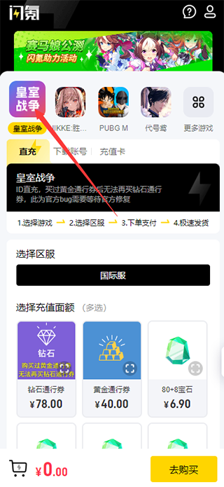 2、然后找到皇室战争国际服,选择自己想要充值的内容;
