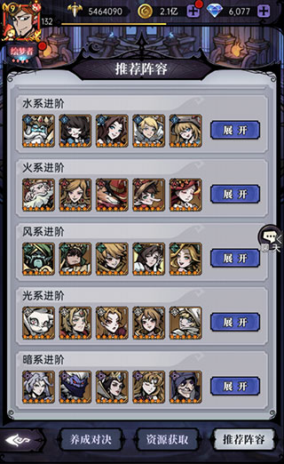 1、冒险者们在城堡里面召唤伙伴,可以在界面右上角的推荐栏里面查看推荐阵容,根据自身目前拥有的伙伴或想走的阵容路线进行选择。