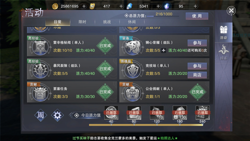 此外,参与一些限时活动也能获得不少的资源,比如炼金初试是每天12:30开启,篝火晚会每天19:30开启,而像炼金复试、炼金终试、公会竞速、神祠盛宴会在特定的时间开放,大家有空的话都可以参与下,因为可以获得额外的经验值和奖励。