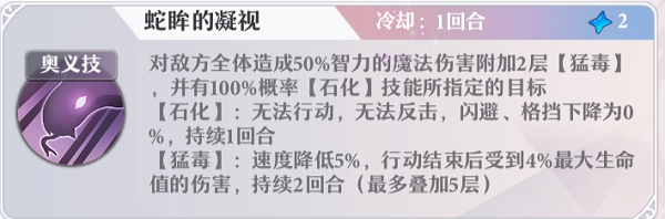 美杜莎的基础速度比晴明还要快20点,搭配她100%石化目标的奥义技,注定了竞技场的地位。先手石化对方的控制英雄,然后我方晴明再冻住对方其他人,小丑看血量进行单点或AOE。