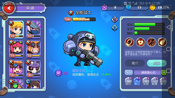 游戏特色包括多种模式(求生、经典竞技等)、5分钟快速对决、丰富的英雄技能组合以及灵活的角色切换。自动射击的设计让操作更便捷,重点在于走位和大招的精准释放。新人玩家可以从“全能战士”开始,这个英雄适合上分,被动技能和简单易用的技能组合让它成为入门首选。