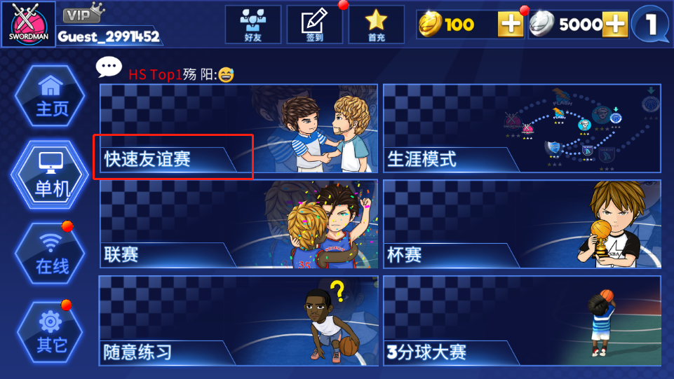4、装备好后,先来练习一下,点击【快速友谊赛】;