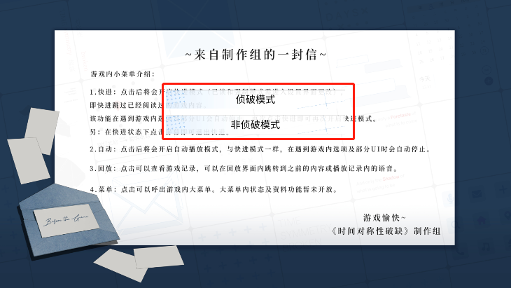 2、然后可以看一下来自制作组的一封信;上面有写本次剧情开放的部分、游戏内部分已开放的功能介绍以及游戏内小菜单的介绍;