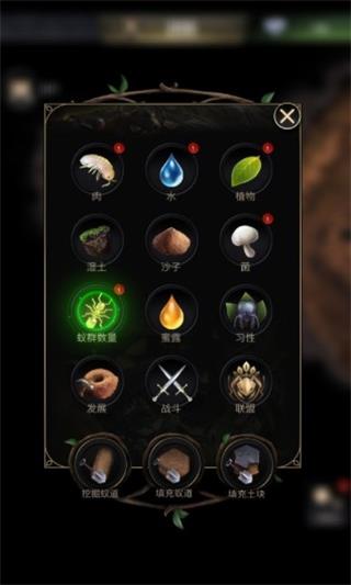 本作的蚁巢建设很简单明了,就是挖洞-铺巢-升级。