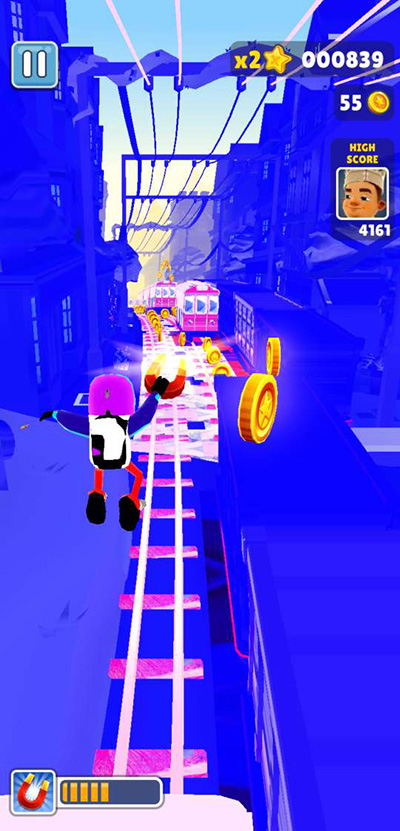 获得飞行背包(Jetpack)后,在道具有效时间内,可在空中飞行,不会遇到障碍物及火车,但仍然可收集金币。