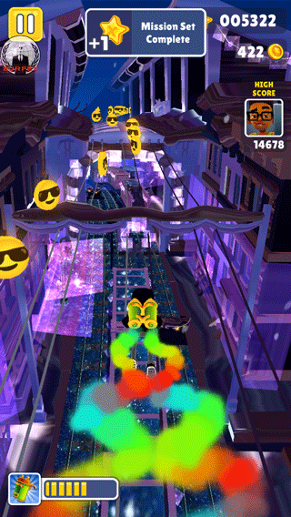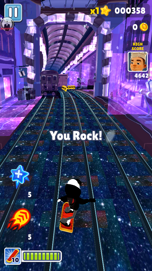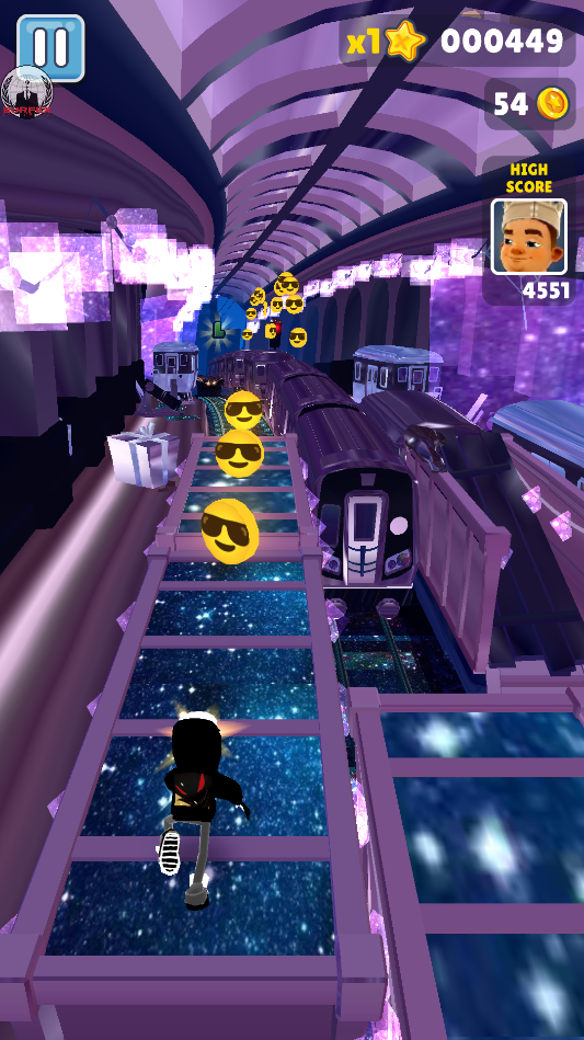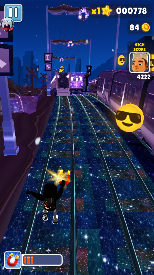 地铁跑酷宇哥4.0版本是根据地铁跑酷而定制的魔改版本,整个地图的背景都变成了紫色星空的设计,让地铁跑酷呈现出一种浪漫的柔和美。游戏中可拾取的金币修改成了墨镜酷酷的笑脸金币,整个体验起来就想是在星空上跑酷一样,手感非常好。游戏玩法非常简单,上滑手指可以使主角跳跃,下滑手指可以使主角滑行,左右滑动手指则可以在不同的轨道上切换。玩家需要巧妙地操作,以避免与列车相撞、撞到障碍物或被追捕者抓住。且在这个过程当中你还可以获取许许多多的道具,比如火箭推进背包、气垫滑板等等,以此用来轻松的躲避警察的追捕。游戏中有多个可供选择的角色,每个角色都有独特的特殊能力和外观,玩家可以选择不同的角色和滑板皮肤,为你的跑酷提升手感。如果你也想体验不同风格的地铁跑酷,不妨试试这款地铁跑酷宇哥4.0版本,感兴趣的朋友快来当快下载体验吧!