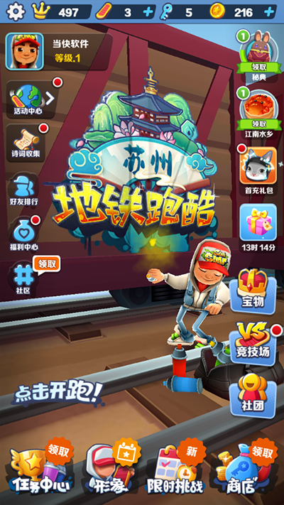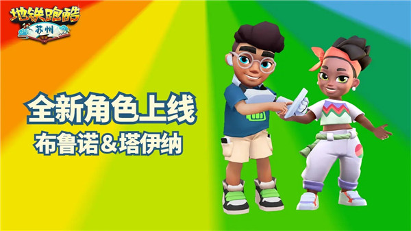 《地铁跑酷》世界之旅新旅程再一次来到了中国江南水乡——江苏!与全新角色【方圆】和【墨韵】一起踏上最新的苏州之旅吧!在地铁跑酷苏州版中,风景如画的苏州园林让你仿佛置身于一幅山水画卷之中,玩家在跑酷的过程中欣赏这座城市的风景,同时地铁跑酷苏州版还上线了两个国风角色【方圆】和【墨韵】和一些新的滑板背饰。游戏玩法设定没有变化,只是把之前的保安换成更具有国风特色的衙役,玩家要帮助杰克和淘气的小伙伴们逃离衙役的追捕,在奔跑的过程中,玩家可以沿途拾取金币、钥匙、道具等物品,同时需要躲避前方列车和其他物体的障碍,直到玩家撞上障碍物,或者被列车撞到被衙役抓住,游戏就会结束。话不多说,快来下载试试吧!