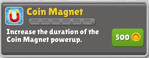 看名字相信已经猜出,磁铁的作用就是吸取金币,当然只有获得更多的金币才能解锁角色,以及购买和升级道具。