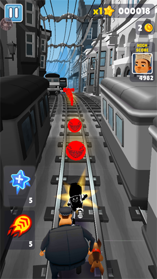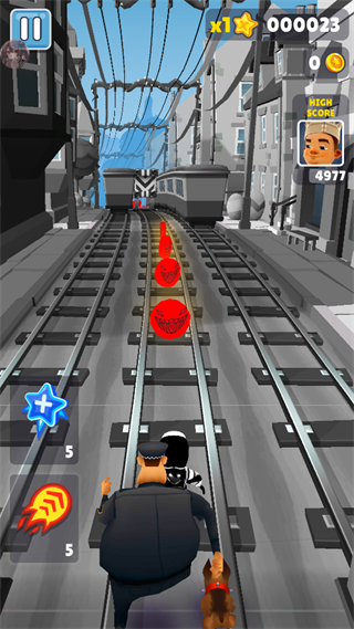 双击屏幕可启动滑板道具,如果在没有启动滑板功能的情况下,角色撞上障碍物或者火车游戏就会结束,而在滑板状态下,等于给角色买了保险,滑板会在撞到障碍物时消失,但游戏可以继续进行。滑板在消失后的几秒内出现冷却时间,当闪烁结束后可通过双击再次启动,没有次数的限制。
