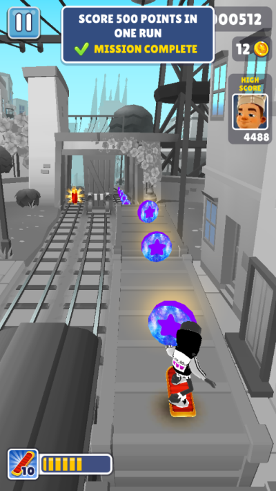 游戏里障碍物很多,经常有双重障碍和视线被挡的情况,得提前预判才能避开追尾的人和迎面而来的火车,不然很容易失误。金币收集起来可以去商店买各种道具,比如加速、磁铁、滑板啥的,合理使用道具能大幅提升成绩,这点设计挺贴心的。
