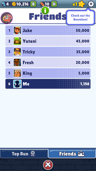 地铁跑酷作为一款出色的跑酷游戏,社交功能当然必不可少,玩家可以邀请好友一起进行游戏,并和他们一较高下,也可以帮助好友赚取更多金币。在游戏主界面点击社交按钮,进入好友列表会显示好友最高成绩,根据积分显示看看自己到底处于什么水平。