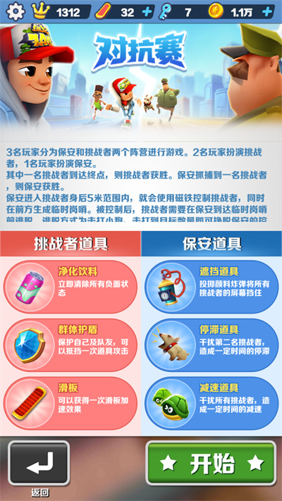 《地铁跑酷保安版》是一款由深圳市创梦天地科技有限公司开发的跑酷新版本,新增了“对抗赛”模式。游戏中,玩家分为挑战者和保安两阵营:两名挑战者需要在疾驰的列车中躲避障碍并尝试到达终点,而保安则要抓捕挑战者。游戏规则简单明了——挑战者成功逃脱则赢,保安抓到人则胜。