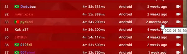 再往前翻看前一百名的历史记录,你能发现早在两个月之前的6.30号就已经有挑战者参与投稿了,并且目前成绩还能保持在榜上,可想而知这款游戏因为这个“挑战”已经在国外火了两个月有余了!!!