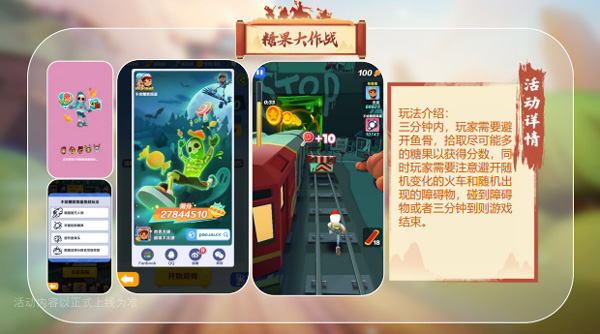 三分钟限时内,玩家需要避开鱼骨,拾取尽可能多的糖果以获得分数,玩家需要注意避开随机变化的火车和随机出现的障碍物,碰到障碍物或者三分钟到则游戏结束。