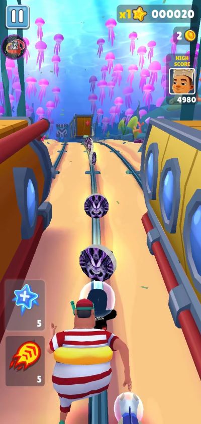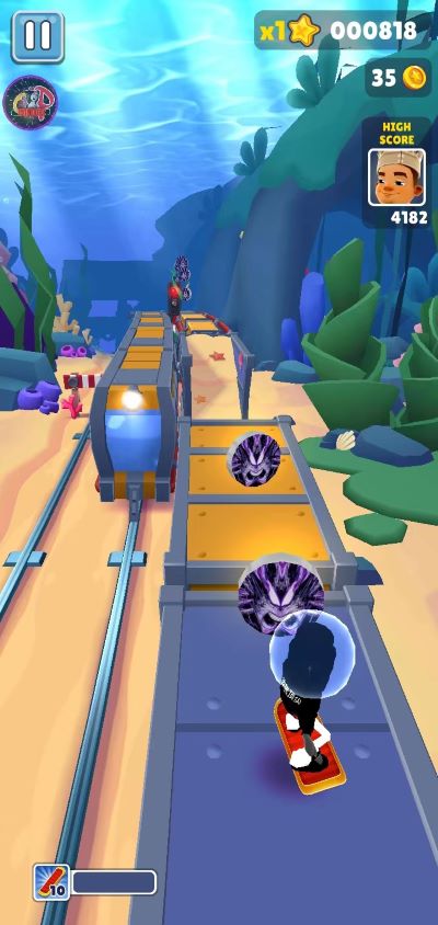 在过程中,玩家还可以通过使用特殊技能,比如乘坐滑板、飞天跳、滑行、转弯等各种操作来获取道具和躲避陷阱,让你的游戏过程更加精彩。不过需要注意的事:跑酷的时候还需要时刻保持警觉,一旦被车厢、障碍物、警察等物品跟踪捕捉到,就会游戏结束。